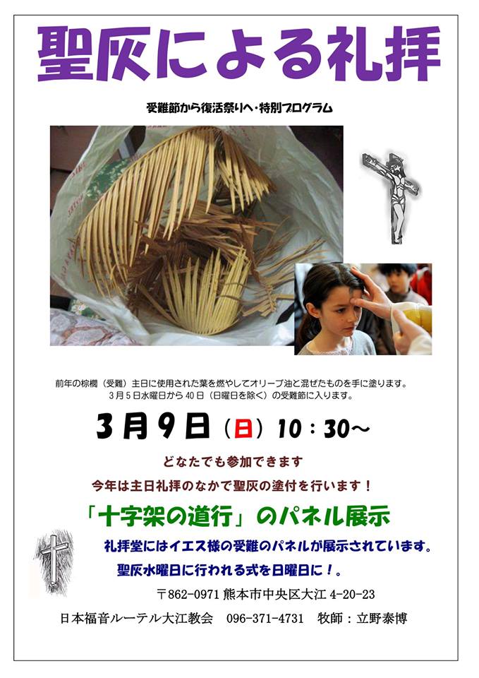 今年受難節が近づいてきました。2014年は3月5日の聖灰水曜日から日曜日を除く40日が受難節です。復活祭は4月20日となります。毎年聖灰水曜日には受難節に入る礼拝をしていましたが、今年は日曜日に聖灰の礼拝をおこないます。どうしても週日にこれない方が多く、それならば日曜にとなりました。どうぞ覚えておこしください。
